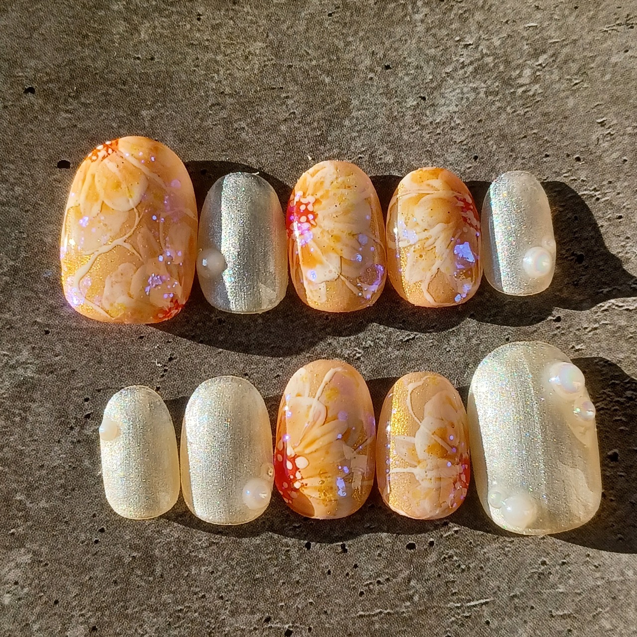 【受注製作】フラワー オレンジ ネイルチップ No.39