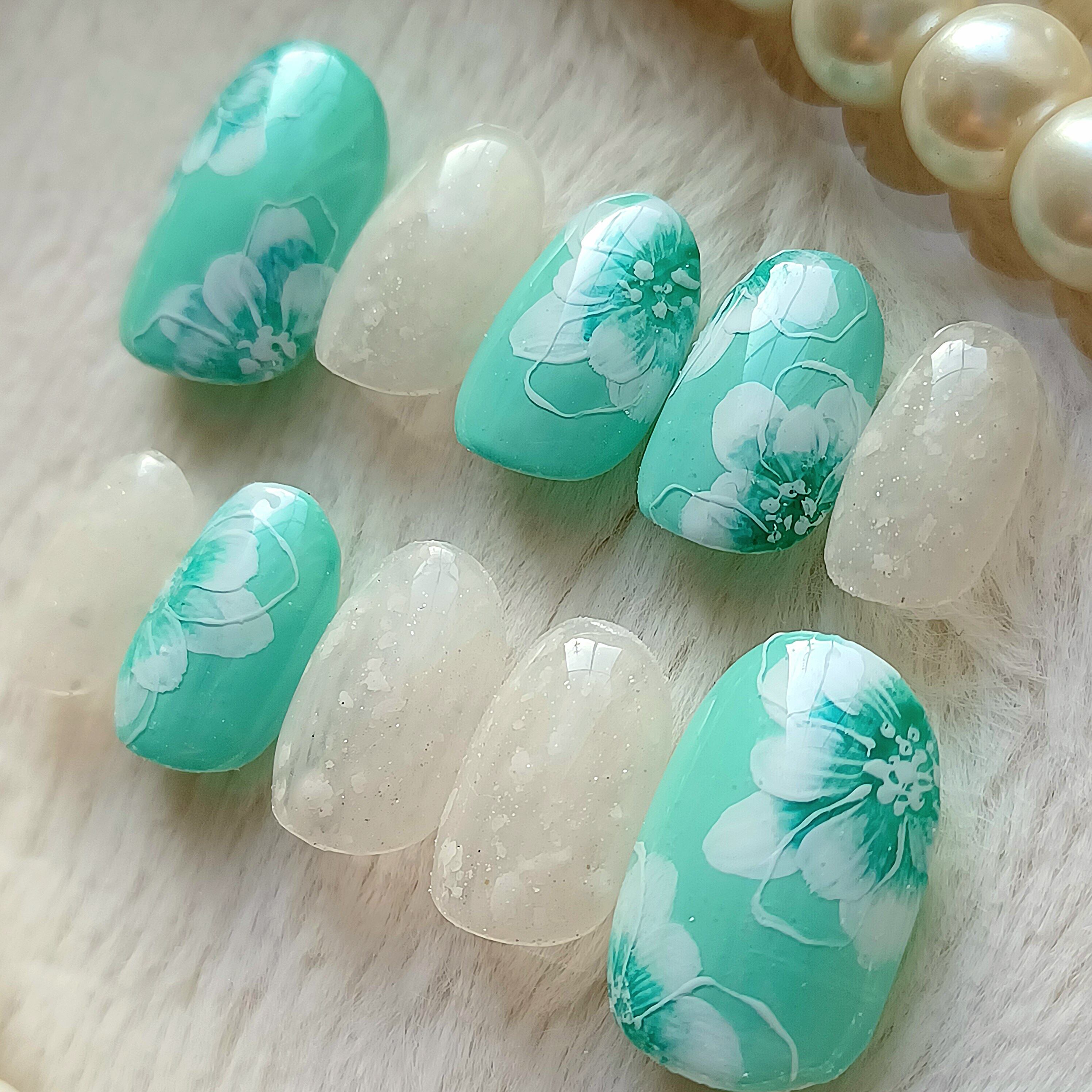 ネイルチップ販売 オーダーネイルチップ 大人かわいい 成人式 振袖 卒業式 入学式 結婚式 お呼ばれ ウェディング ブライダル 前撮り 七五三 お祭り イベント フェス 旅行 お出掛け デート 女子会 お正月 クリスマス 普段使い 個性派 手描きフラワー お花 手書き キラキラ 白無垢 和装 お正月 年越し お花見 派手 華やか グリーン