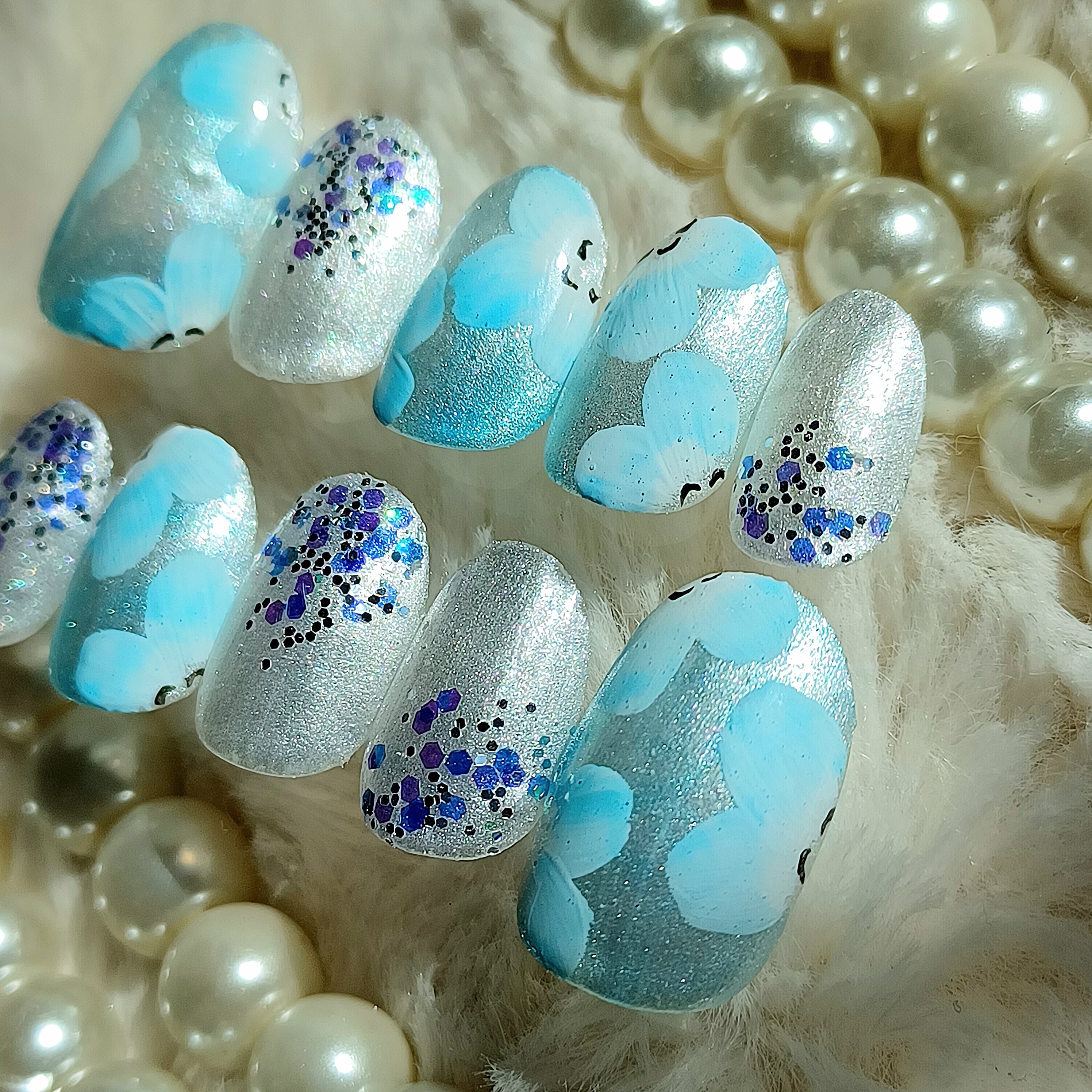 ネイル ネイルチップ ネイルデザイン ネイルアート ネイルチップ販売 オーダーネイルチップ 春ネイル 春デザイン フラワー お花 手描き 手書き 大人かわいい 卒業式 入学式 結婚式 お呼ばれ ウェディング ブライダル 前撮り ブルー 水色 パールカラー
