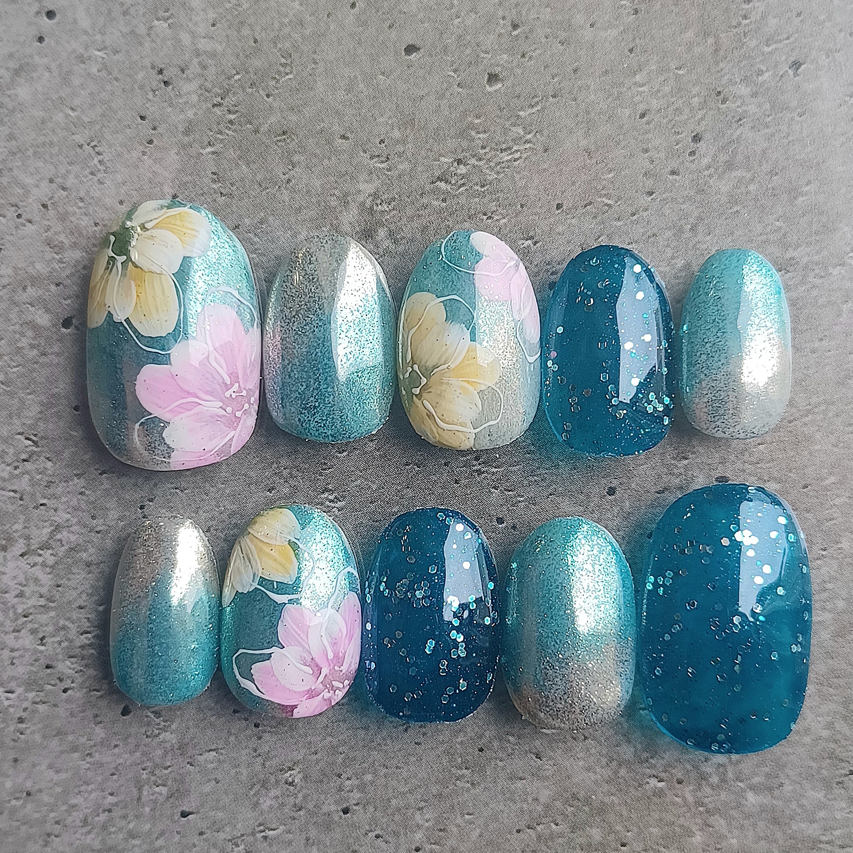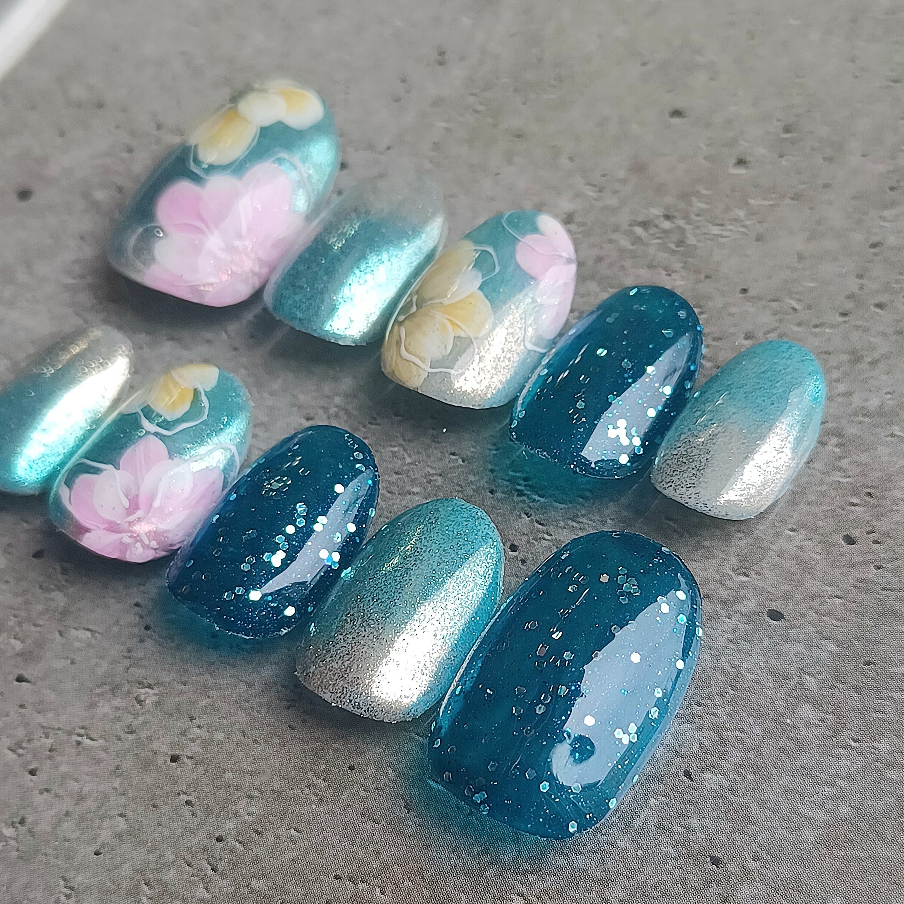 ネイル ネイルチップ ネイルデザイン ネイルアート ネイルチップ販売 オーダーネイルチップ 夏ネイル 夏デザイン 大人かわいい 手描き 手書き フラワー 花 青 ブルー シルバー ミラー 銀 卒業式 入学式 結婚式 お呼ばれ ウェディング ブライダル 前撮り 七五三 お祭り イベント フェス 旅行 お出掛け デート 普段使い