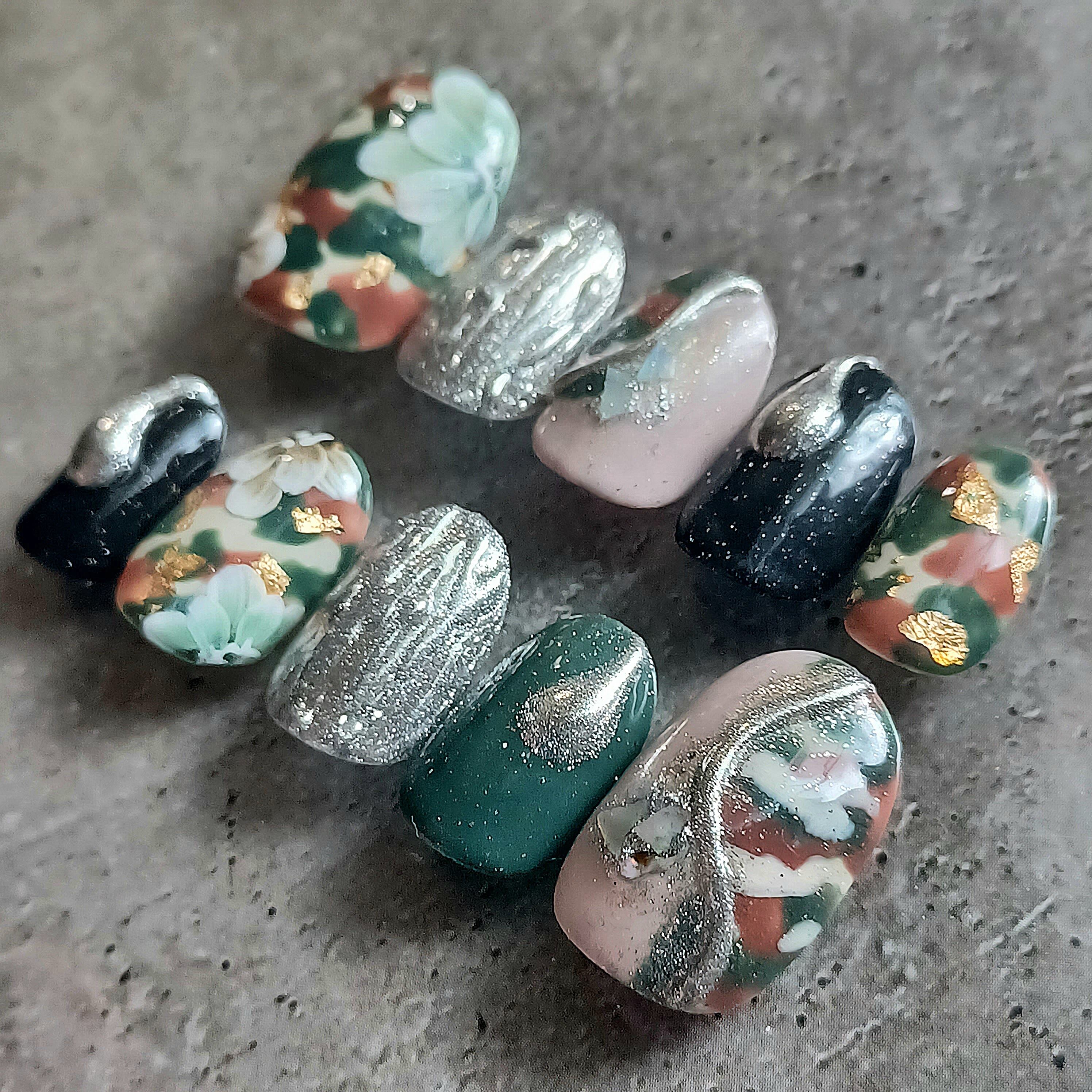 ネイル ネイルチップ ネイルデザイン ネイルアート ネイルチップ販売 オーダーネイルチップ 大人かわいい 卒業式 入学式 結婚式 お呼ばれ ウェディング ブライダル 前撮り 七五三 お祭り イベント フェス 旅行 お出掛け デート 女子会 普段使い 花 フラワー 手描き 手書き 迷彩 カモフラージュ ミリタリー 秋デザイン 秋ネイル 茶色 ブラウン 緑 グリーン ニュアンス ミラーアート