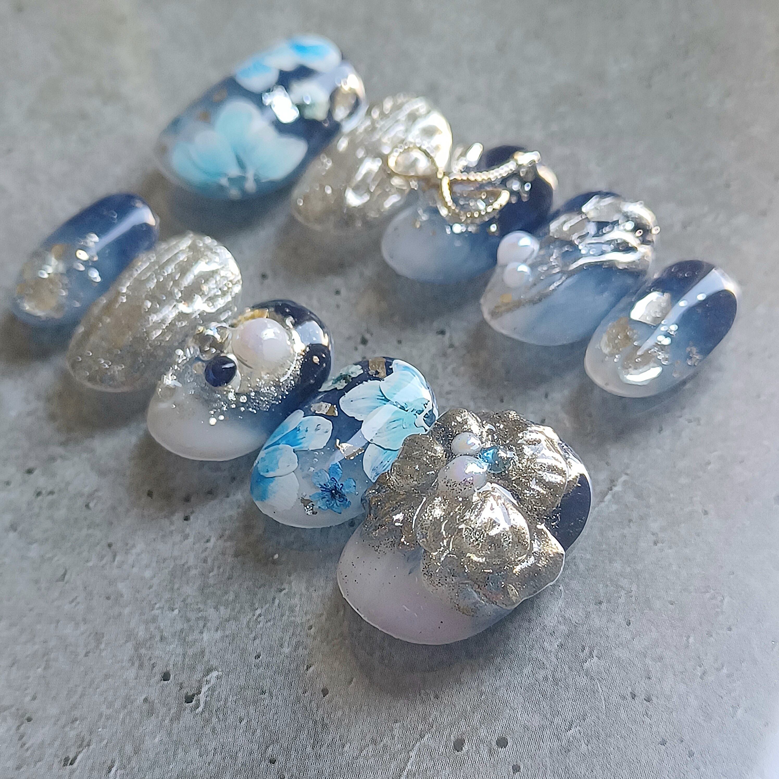 ネイルチップ販売 オーダーネイルチップ 大人かわいい 成人式 振袖 卒業式 入学式 結婚式 お呼ばれ ウェディング ブライダル 前撮り 七五三 お祭り イベント フェス 旅行 お出掛け デート 女子会 普段使い 個性派 手描きフラワー 手書き ミラー 立体フラワー ぷっくりフラワー キラキラ ネイビー ホワイト 紺 白 青系